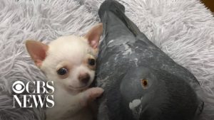 Special-needs puppy and pigeon who can’t fly form unlikely friendship.