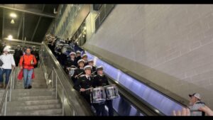 Navy drumline rides escalator.