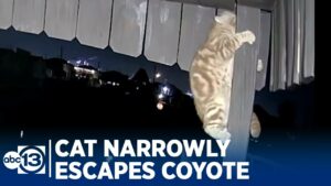 Cat narrowly escapes coyote attack.