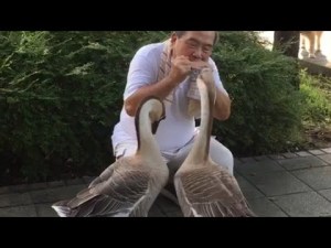 Man serenades geese with harmonica.