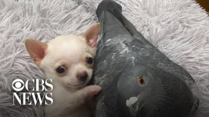 Special-needs puppy and flightless pigeon form beautiful friendship.