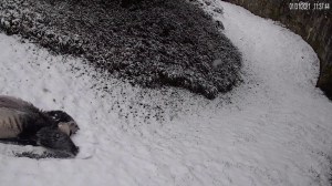 Giant pandas frolic in the white snow.